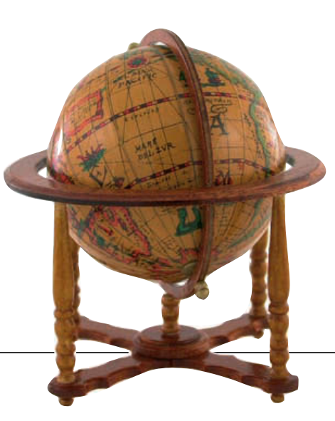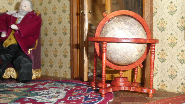 Er ligt geruime tijd een voorbeeld van een antieke globe in de schaal 1:12 voor een poppenhuis. Na lang zoeken een passende ronde bol met de gewenste diameter gevonden.