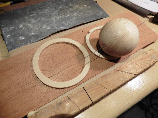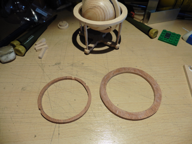 Een zelfde soort probleem ook met de ringen voor de globe. Mahonie in dunne vorm is vrij zacht en heeft een grove structuur, dat gemakkelijk versplinterd. Ook hier twee ringen uit multiplex gemaakt.