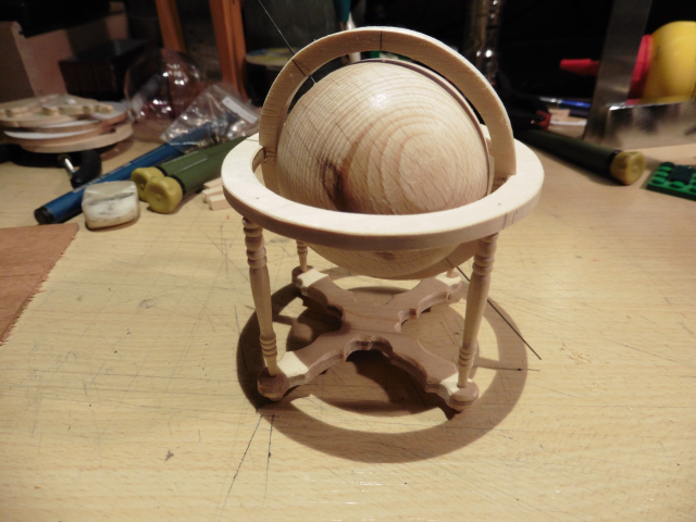 Tijdelijk de globe los in elkaar gezet. De bol krijgt de landkaart opgeplakt en alles wordt in de mahonie vernis gezet.