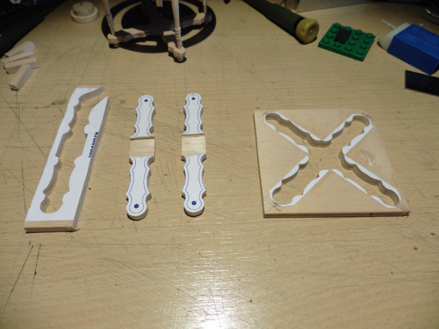 Het maken van de kruisvoet gaat niet helemaal naar wens. Na het zagen trekt het lindehout krom. Dan een komplete kruisvoet uit multiplex gezaagd. Dat trekt niet krom.