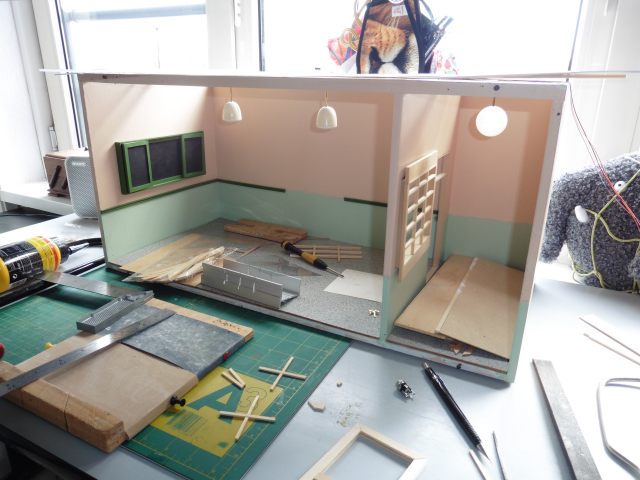 De schoolklas gaat verder afgebouwd worden. Er is wat ruimte gemaakt waar rustig diverse onderdelen in elkaar gemeubeld kunnen worden. Veel materiaal is voorradig en wat reeds verzameld was weer opgezocht en afgestoft.